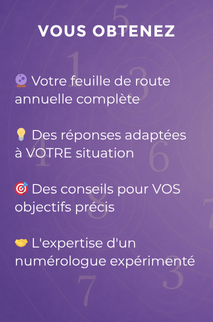 💫 À partir de votre date de naissance, vos prénoms et votre nom de naissance, nous analysons votre cycle personnel actuel et vous révélons les énergies qui colorent chacun de vos mois. Puis, vous échangez avec votre numérologue pour explorer les aspects qui VOUS concernent vraiment.