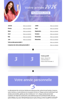 Imaginez avoir sous les yeux la carte de votre année. Savoir que mars sera propice aux rencontres, que juin soutiendra vos ambitions professionnelles, et que septembre demandera davantage de diplomatie. Votre Thème Numérologique Annuel vous offre cette vision d'ensemble : un document complet à consulter quand vous en avez besoin, mois après mois.